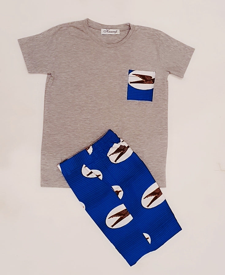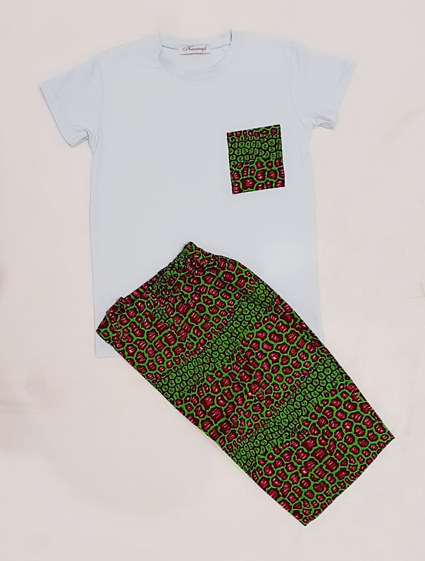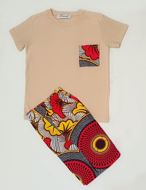 Un ensemble composé d'un magnifique tee-shirt coloré en coton et d'un short entièrement fait main avec du wax. Le combo apporte un style élégant et chic.
